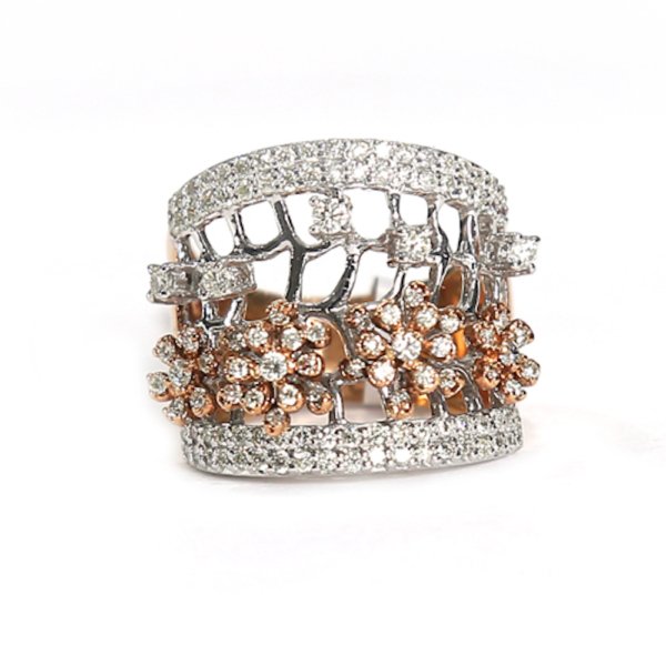 An Ornate piece by Krown Kouture, The Accord exhibits the modern yet aesthetic feminine appeal. A modern and streamlined cocktail ring, yet perfectly timeless. The adeptly woven nest with its delicate flowers is in perfect accord with each other giving the piece an exclusive look.